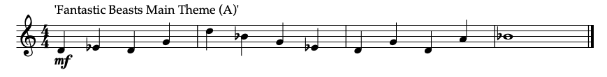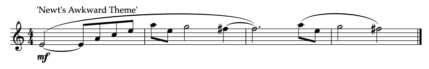 It ends on a dominant pedal which is usurped by a brand new theme on the clarinet for Newt, heard when he reaches for the door handle and is stopped by Queenie, and is thus labelled ‘Newt’s Awkward Theme’.