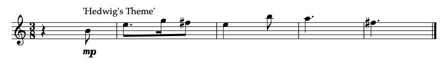 The quiet, inverted, dominant violin pedal kicks in after this, so we can hear Newt tell Jacob that they are indeed in the Room of Requirement. As Jacob and Dumbledore vanish through the mysterious, cylindrical Portkey, another quick crescendo brings us up into the next section of the trailer. A quick, dramatic one bar made up simply of the first, second, third and sharpened seventh scale degrees, before cutting to silence, as Dumbledore awards Newt some house points. A tonic chime coupled with John Williams’ ‘Hedwig’s Theme’ accompanies the title card, as Fantastic Beasts: The Secrets of Dumbledore is emblazoned on our screens, with a magical Phoenix silhouette behind it. However ‘Hedwig’s Theme’ is rehamonised – the penultimate note is harmonised in its major form, instead of the diatonic minor it should be, creating a parallel major movement between itself and the last chord, the major dominant chord in F# minor.